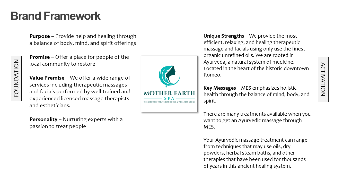 The Mother Earth Spa brand framework shows how a small organization can strategize its foundational pillars to align with its activational elements. After brand identity work and messaging audit, we shaped key messages to reflect the value and strengths at the heart of the business. These messages are leveraged for marketing promotions, email communications, signage and everything in between.
